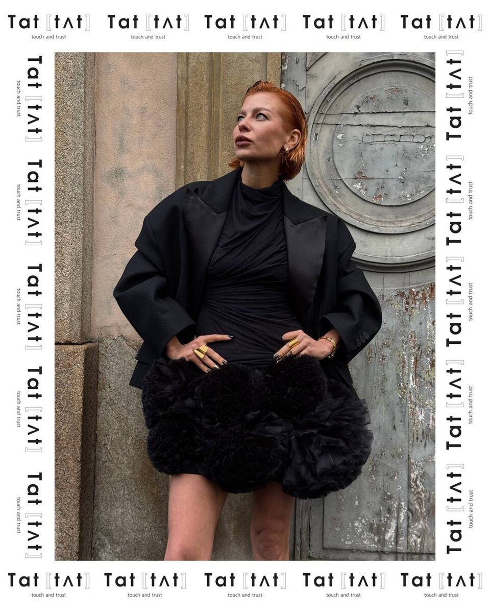 На показ Elisabetta Franchi был выбран тотальный черный с объемной юбкой российского Maison Barbino и драпированным топом Autentiments.