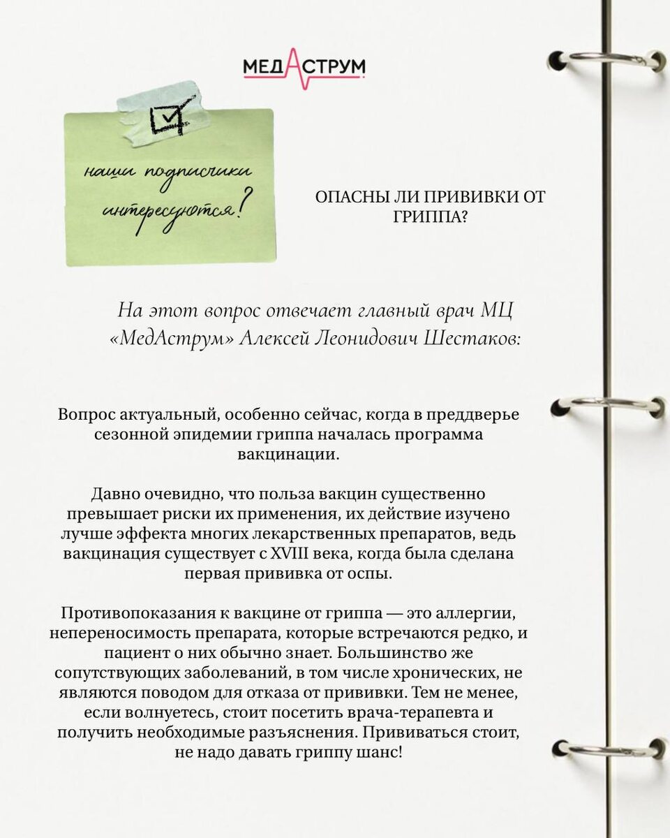 ОПАСНЫ ЛИ ПРИВИВКИ ОТ ГРИППА? На этот вопрос отвечает главный врач МЦ «МедАструм» Алексей Леонидович Шестаков: 🔍Вопрос актуальный, особенно сейчас, когда в преддверье сезонной эпидемии гриппа началась программа вакцинации. Давно очевидно, что польза вакцин существенно превышает риски их применения, их действие изучено лучше эффекта многих лекарственных препаратов, ведь вакцинация существует с XVIII века, когда была сделана первая прививка от оспы. 🔍Противопоказания к вакцине от гриппа — это аллергии, непереносимость препарата, которые встречаются редко, и пациент о них обычно знает. Большинство же сопутствующих заболеваний, в том числе хронических, не являются поводом для отказа от прививки. Тем не менее, если волнуетесь, стоит посетить врача-терапевта и получить необходимые разъяснения. 🔍Прививаться стоит, не надо давать гриппу шанс!
