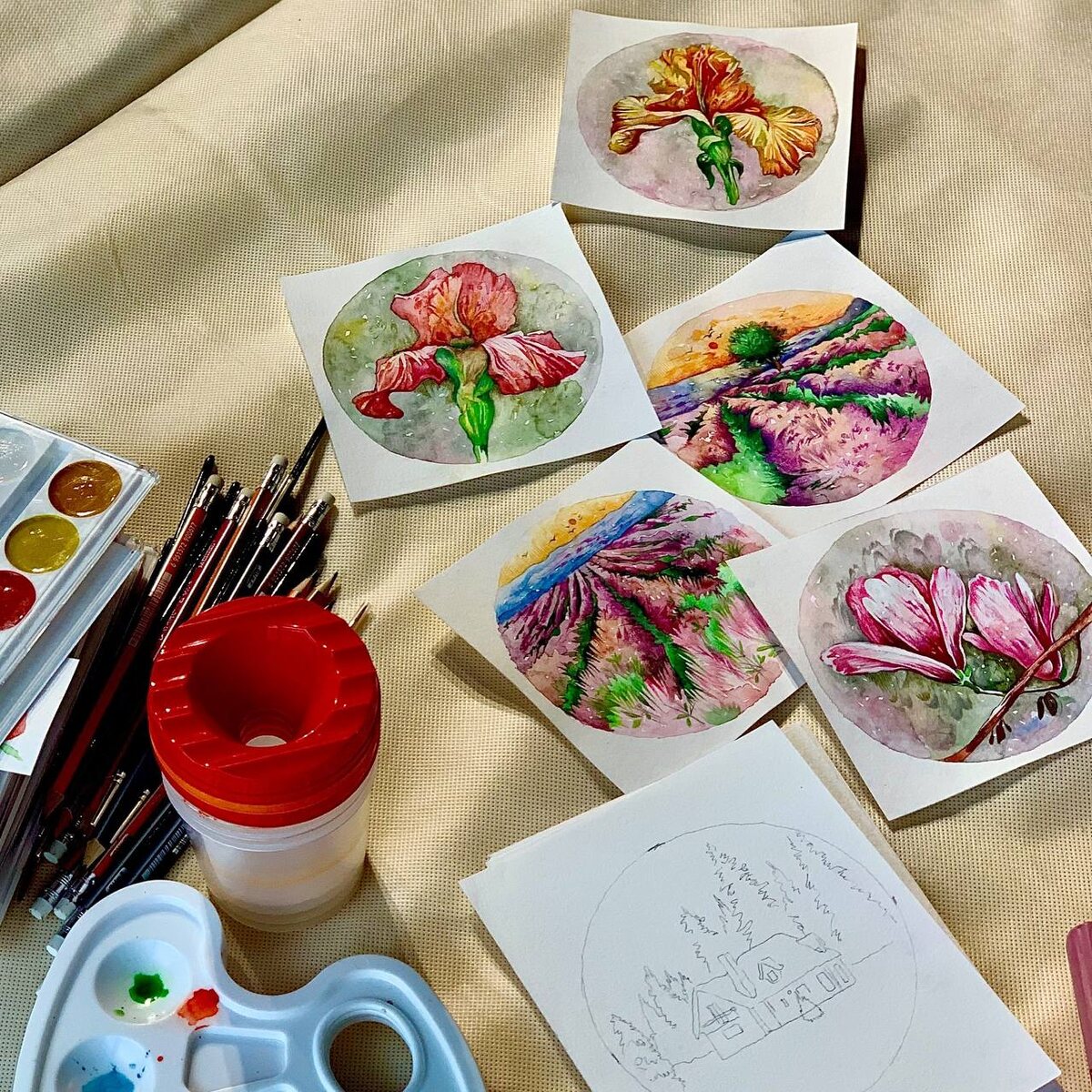 Я в основном работаю акварелью🖼️🎨, часто добавляю акварельные карандаши ✏️ . Бывает, что в процессе появляются гуашь, ручки и фломастеры – в общем, все, что попадается под руку. Этот экспериментальный подход позволяет мне находить новые решения и вдохновение в каждом произведени 🖼️ .