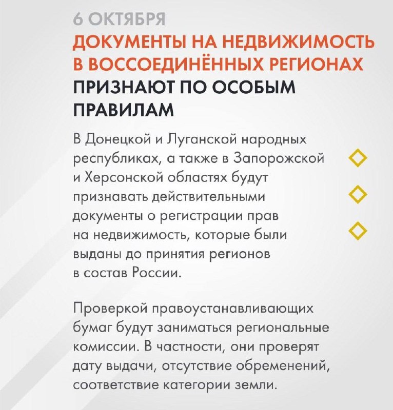 ✅ Легализация недвижимости в новых регионах С 6 октября в России будут признаваться документы на недвижимость в Донбассе и Новороссии, выданные до их присоединения. Для проверки документов создаются специальные комиссии, которые будут работать до 2028 года. ➡️ Документы, выданные Украиной после вхождения в РФ, недействительны Подписаться | Наш чат