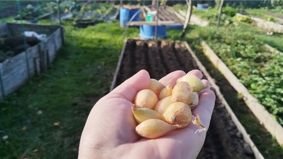Лук можно сажать осенью под зиму, но важно правильно выбрать сроки, сорт и подготовить грядку. Осенняя посадка позволяет луковицам укорениться и начать расти, как только наступают первые тёплые дни, что выгодно по сравнению с весенними посадками. Место для посадки должно быть солнечным, возвышенным, без застоя воды. Лучшие предшественники: огурцы, томаты, картофель, бобовые. Я выбрала грядку после огурцов. Почву перекапывают на глубину 25–30 см, удаляют все сорняки. В борозды вношу горчичный жмых, просто припушаю борозды, так как надо делать строго по инструкции. Использую как средство от вредителей при посадке лука. Жмых помогает отпугнуть и справиться с луковой и морковной мухой, проволочником, нематодой, подгрызающей совкой, личинками майского жука. Посадка севка Глубина: 3–4 см. Расстояние между луковицами: 8–10 см. Между рядами: 15–20 см. Этапы: 1. Выкопайте борозды глубиной 5–6 см. 2. Разместите луковицы донцем вниз. 3. Присыпьте сухой землёй или перегноем. 4. Легко утрамбуйте по