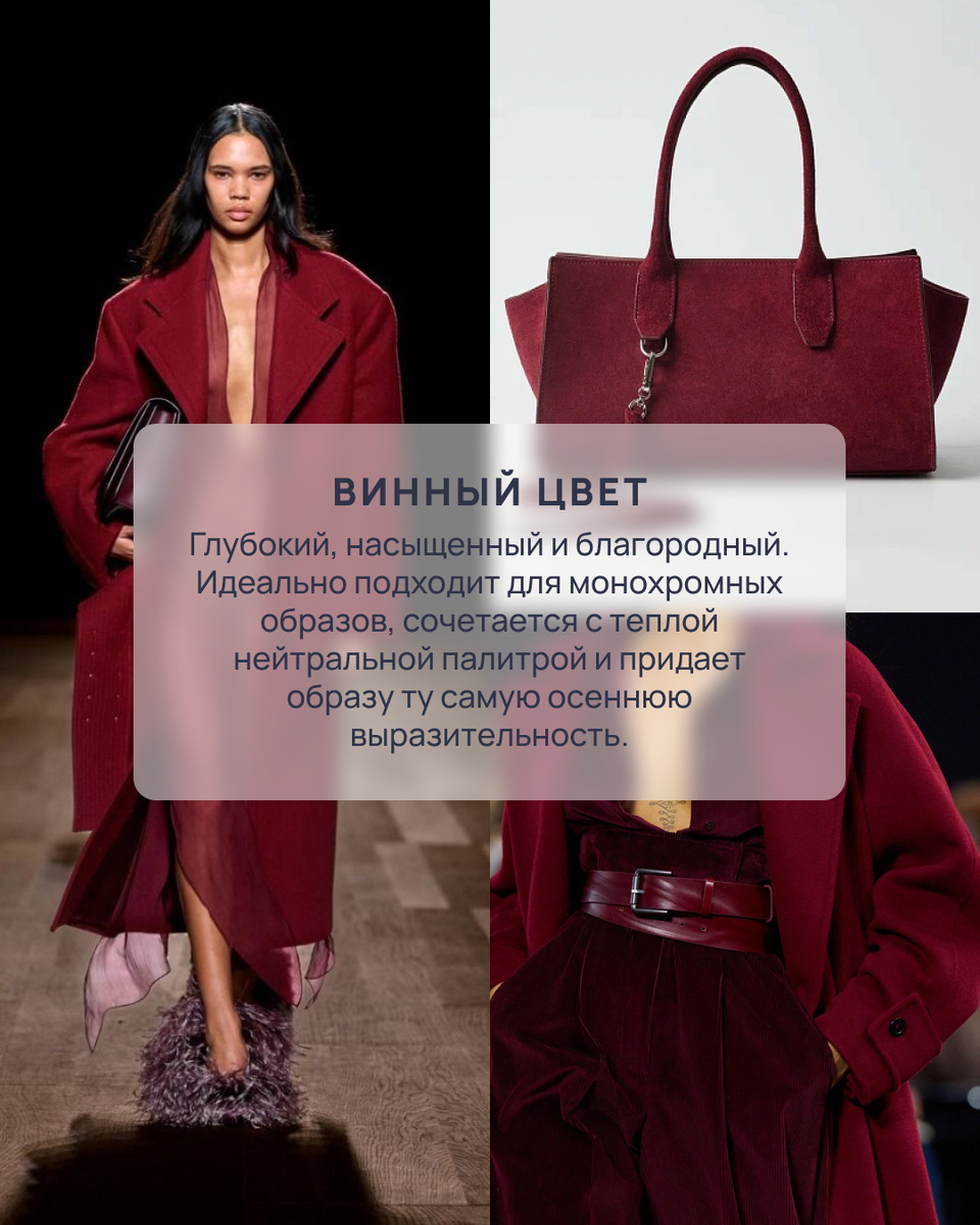Бордо, мех, двойные ремни и сила «О» Всех модных тенденций и актуальных приемов за раз не перечислить, поэтому возвращаемся со второй частью — сегодня в подборке пять трендов для самых стильных образов на межсезонье. А винный цвет — один из самых популярных в этом сезоне (впрочем, он уже давно покорил наши гардеробы). Глубокий, насыщенный и благородный. Он идеально подходит для монохромных образов, сочетается с теплой нейтральной палитрой и придает ту самую осеннюю выразительность. Носите его в монохромных стилизациях или вместе с другими оттенками — в любом случае он прекрасно передаст краски меняющейся природы. Кстати, в одной из статей уже рассказали, с какими цветами винный особенно хорош. Этой осенью искусственный мех выходит за рамки привычного. Если вы хотите добавить в гардероб чего-то мягкого и пушистого, то ограничиваться шубой вовсе не обязательно — выбирайте кардиганы и сумки, украшенные мехом, обувь или аксессуары. Получится стильно, экологично и по-настоящему уютно. Однов
