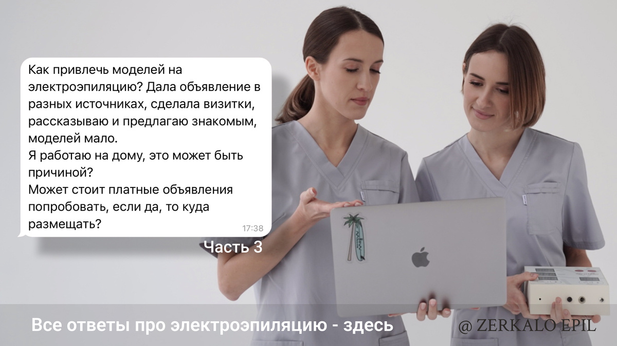Так что не так с объявлением из 1 ЧАСТИ? Рубрика “ответы на вопросы” ❌ Для модели не понятно, что за процедура, какой результат она получит и что от неё вообще хотят… Люди не любят спрашивать. Если непонятно - все просто пройдут мимо. ❌ Эстетики тут нет. Хорошо, что разбито на абзацы, читаемо. Но куча лишних знаков, двоеточий, лишние точки и их отсутствие, там где надо бы. Эмоджи в непонятных местах. 3 восклицательных знака!!! Это вообще табу, ощущение же, что на тебя наорали текстом 😄 Что ещё не так: ❌ Бесплатно, но оплата за расходники… После этого ощущение, что тебя немного обманули… Про работу с моделями платно/бесплатно отдельная тема, но у нас тут однозначная позиция: с моделями нужно работать бесплатно. 🔗 Интересный индикатор: если у вас от этой фразы внутри вспыхнуло возмущение - вам клиенты не будут нести много денег:) Это не шутка. А в целом, себестоимость электроэпиляции очень низкая. Не жопьте 100р :) платных моделей найти намного сложнее, чем бесплатных. Так и будете с