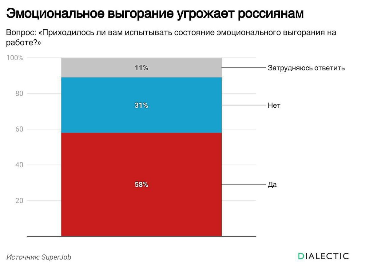 В России эмоциональное выгорание стало причиной увольнения для многих работников. Согласно опросу SuperJob, 58% экономически активных россиян испытывали это состояние, и половина из них в итоге покинула работу. Этот опрос охватил 3000 работающих граждан старше 18 лет из всех регионов страны и выявил, что с выгоранием чаще сталкиваются женщины (61%), люди старше 45 лет (61%) и обладатели высшего образования (69%). Особенно часто увольняются из-за выгорания женщины (53%), сотрудники старше 35 лет и те, чей доход не превышает 100 тысяч рублей в месяц (54%). Несмотря на распространенность проблемы, лишь 23% сотрудников обращаются за помощью к руководству. И даже в этом случае поддержку получают только 28% обратившихся, а 65% остаются один на один со своей проблемой. Интересно, что люди с более низким доходом реже обращаются к руководству (лишь 15% при доходе до 50 тысяч рублей), что может быть связано с опасениями потерять работу.