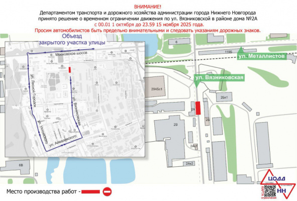 Движение транспорта будет временно ограничено по улице Вязниковской напротив дома №2А с 00.01 1 октября до 23.59 15 ноября. Объезд будет организован по прилегающим улицам.