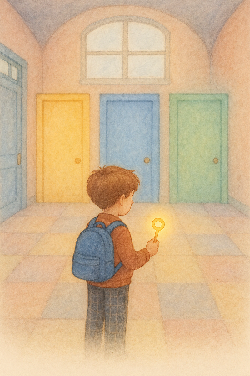 Терапевтическая сказка и практический гайд для родителей о трёх простых способах начать разговор — вопрос, улыбка, помощь; Слушайте аудиоверсию в нашем телеграм-канале Витя перешёл в новую школу. В классе все давно знали друг друга, а он сидел за последней партой и молчал, прячась за книжкой и слушая, как ребята смеются и придумывают игры. «Хочется с ними, а как начать?..» — подумал Витя. В портфеле Витя нашёл маленький блестящий ключик с надписью «Для разговора» — тёплый, будто живой. — «Что это значит?» — прошептал он. Рядом появился зелёный лесной человечек с добрыми глазами: — «Этот ключик открывает двери к друзьям — не деревянные, а разговорные. Хочешь попробовать?» Витя кивнул, и в воздухе вспыхнули три дверцы. - Жёлтая — с вопросительным знаком. - Синяя — с улыбкой. - Зелёная — с ладошкой. — «Это три способа начать разговор: спросить, улыбнуться, предложить помощь. Выбирай и тренируйся», — сказал человечек. Витя подошёл к жёлтой двери: «Когда задаёшь вопрос, ты гово