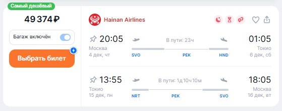 ✈️Москва - Токио (Япония), туда и обратно с багажом, пересадки в Пекине, за 49400 рублей 4 декабря - 15 декабря - https://checkintime.ru/be2l 🏖 Поиск туров | ✈️Авиабилеты