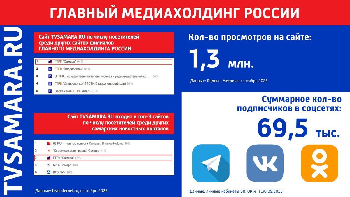 📺 Флагман ГЛАВНОГО МЕДИАХОЛДИНГА РОССИИ — ГТРК «Самара» подтверждает лидерство в медиапространстве 🔹В сентябре 2025 года сайт ГТРК «Самара» собрал более миллиона просмотров, по данным Яндекс.Метрики. 🌐 Согласно Liveinternet.ru, сайт занимает первое место по количеству визитов среди филиалов ГЛАВНОГО МЕДИАХОЛДИНГА РОССИИ. 🏆 TVSAMARA.RU уверенно держится в ТОП-3 новостных ресурсов региона, уступая лишь федеральным агрегаторам. 🗯 В социальных сетях у нас более 69,5 тыс. подписчиков — это сообщество активных и вовлеченных зрителей и читателей. ✈️ Телеграм-канал ГТРК «Самара» демонстрирует рост — индекс цитируемости достиг 1594 упоминаний на 589 каналах. 🔻Мы продолжаем развиваться, чтобы оставаться первыми и приносить вам самые свежие и важные новости региона. Спасибо, что вы с нами! ГТРК Самара MAX lВК lОК lСАЙТ 🔹🔹🔹🔹🔹🔹🔹🔹🔹🔹