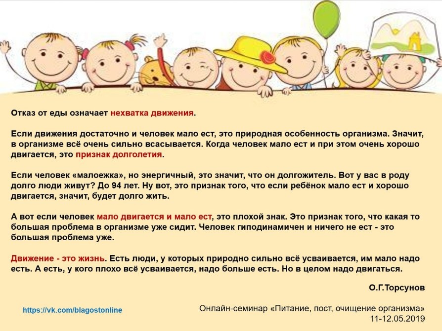 РЕБЕНОК - "МАЛОЕЖКА" Отказ от еды означает нехватка движения. Если движения достаточно и человек мало ест, это природная особенность организма. Значит, в организме всё очень сильно всасывается. Когда человек мало ест и при этом очень хорошо двигается, это признак долголетия. Если человек «малоежка», но энергичный, это значит, что он долгожитель. Вот у вас в роду долго люди живут? До 94 лет. Ну вот, это признак того, что если ребёнок мало ест и хорошо двигается, значит, будет долго жить. А вот если человек мало двигается и мало ест, это плохой знак. Это признак того, что какая то большая проблема в организме уже сидит. Человек гиподинамичен и ничего не ест - это большая проблема уже. Движение - это жизнь. Есть люди, у которых природно сильно всё усваивается, им мало надо есть. А есть, у кого плохо всё усваивается, надо больше есть. Но в целом надо двигаться.