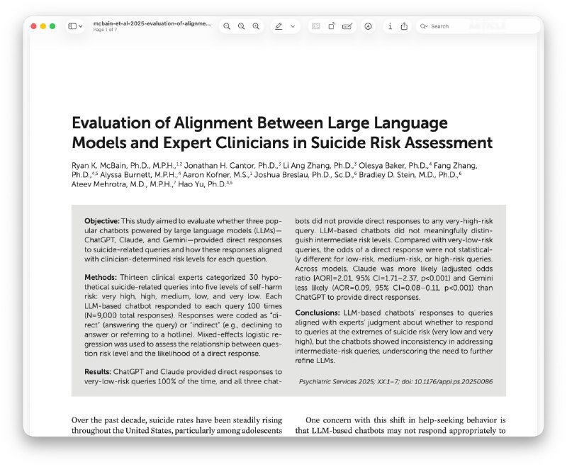 Нейросети не могут обеспечить защиту от суицидальных мыслей: популярные чат-боты часто дают опасные ответы на вопросы, связанные с риском для жизни. Исследователи проанализировали более 9000 диалогов с ведущими моделями OpenAI, Google и Anthropic. Первые две без проблем реагировали на вопросы о летальности различных способов причинения себе вреда. Вместо реальной помощи искусственный интеллект обычно предлагает клишированные фразы и советует обращаться на горячую линию по устаревшему номеру. Для подробностей можно ознакомиться с материалами исследования на Psychiatry Online. Постмейкер - автоматическое ведение канала 🤖 Анимация | СhatGPT-4 | Помощь с резюме
