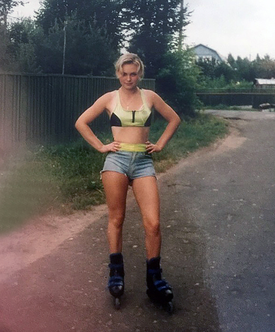 Посмотрите на эту девушку в деревне — ролики, спортивный костюм, накачанные ножки. Тогда это было на пике моды. Фитнес только начинал завоевывать Россию, и спортивная фигура была не обязательным стандартом, а выбором активных и целеустремленных.