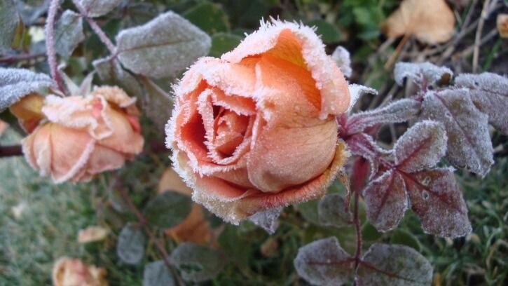 Почему не раньше? Лёгкие заморозки — закалка. Розы привыкают к холоду. Иначе под укрытием сопреют.