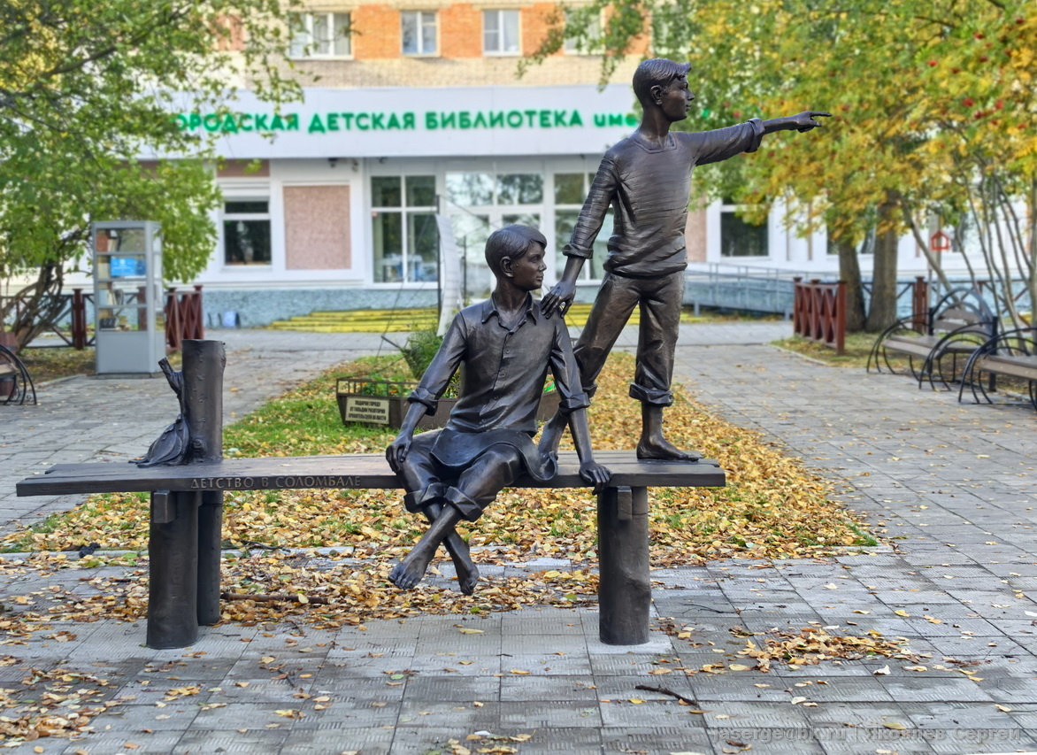В Архангельске в этом году появился новый хороший памятник, посвященный соломбальским мальчишкам - Димке Красову и Косте Чижову (но, конечно же, это памятник всем соломбальским детям и романтике старого Архангельска). Это главные герои книги Евгения Коковина "Детство в Соломбале". Она была переиздана более десяти раз, переведена на 12 языков. Общий тираж — более 2 миллионов экземпляров. Книга по праву считается "самым архангельским произведением". Про нее писали Юрий Казаков, Лев Кассиль и многие именитые литераторы. Летчик-космонавт А. А. Леонов в 1971 году на встрече с молодежью Архангельска рассказывал: "Я впервые нахожусь в Архангельске… Мои знания об этой северной земле складывались из прочитанных книг. Помню, сильное впечатление произвела на меня книжка «Детство в Соломбале»". Автор скульптуры Сергей Сюхин. Мальчишки расположились на деревянном соломбальском причале, здесь и доски и сваи, здесь камбала и карта Архангельска. А также много других скрытых смыслов. Острые арханге