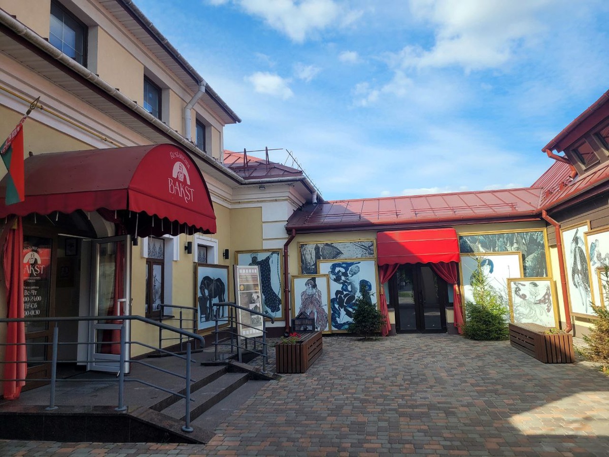 Из Минска в Гродно, самый красивый город Беларуси, я ехала на поезде. Моей соседкой оказалась местная девушка, живущая в Гродно. Я спросила её, какой ресторан в этом городе она советует посетить, куда ходят местные. Девушка без колебаний ответила: "Бакст", добавив, чтобы я туда пришла именно днем. Мол, это лучший ресторан города, а в будни здесь очень хорошие бизнес-ланчи. Так как рекомендациям местных я охотно верю, уже на следующий день отправилась в "Бакст" на обед. Местоположение ресторана наилучшее для туриста. Находится он у старинной пожарной каланчи, в паре минут ходьбы от Старого и Нового Королевского замков. Своим названием ресторан обязан знаменитому уроженцу Гродно - художнику Леону Баксту. Поэтому на стенах, окнах и в холле можно увидеть изображения его картин, на потолке - цитаты и пр. Отдельный восторг - целая стена, состоящая из раскрытых книг и искусственной зелени. Вообще интерьер в "Баксте" очень приятный, сочетает белый, жёлтый, коричневый и красный цвета. Огромные