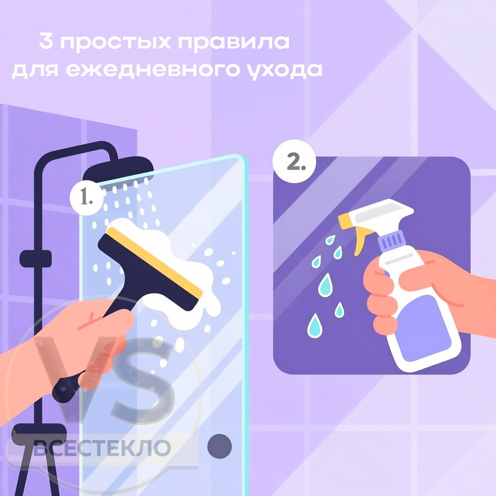 «Запотевание, налет, разводы: как ухаживать за стеклянной перегородкой без спецсредств» ✨ Идеально чистое стекло без разводов — это легко! Рассказываем, как поддерживать безупречный вид вашей душевой перегородки с помощью простых средств, которые есть на каждой кухне. 3 простых правила для ежедневного ухода: После каждого душа — 30 секунд на уход Простой совет, который решает 90% проблем: после использования протрите стекло резиновым скребком-сгонкой. Это предотвратит появление известкового налета. Правило для экономных Смешайте в равных частях воду и столовый уксус (9%), добавьте несколько капель средства для мытья посуды. Распылите на стекло, смойте через 5-10 минут и протрите насухо. Экспресс-метод для блеска Нанесите на сухое чистое стекло обычную полироль для мебели без воска. Она создаст невидимый барьер, который отталкивает капли воды и мыльные брызги. Чего делать НЕ стоит: Использовать абразивные порошки и жесткие щетки Применять кислотные средства для чистки плитки Оставлять