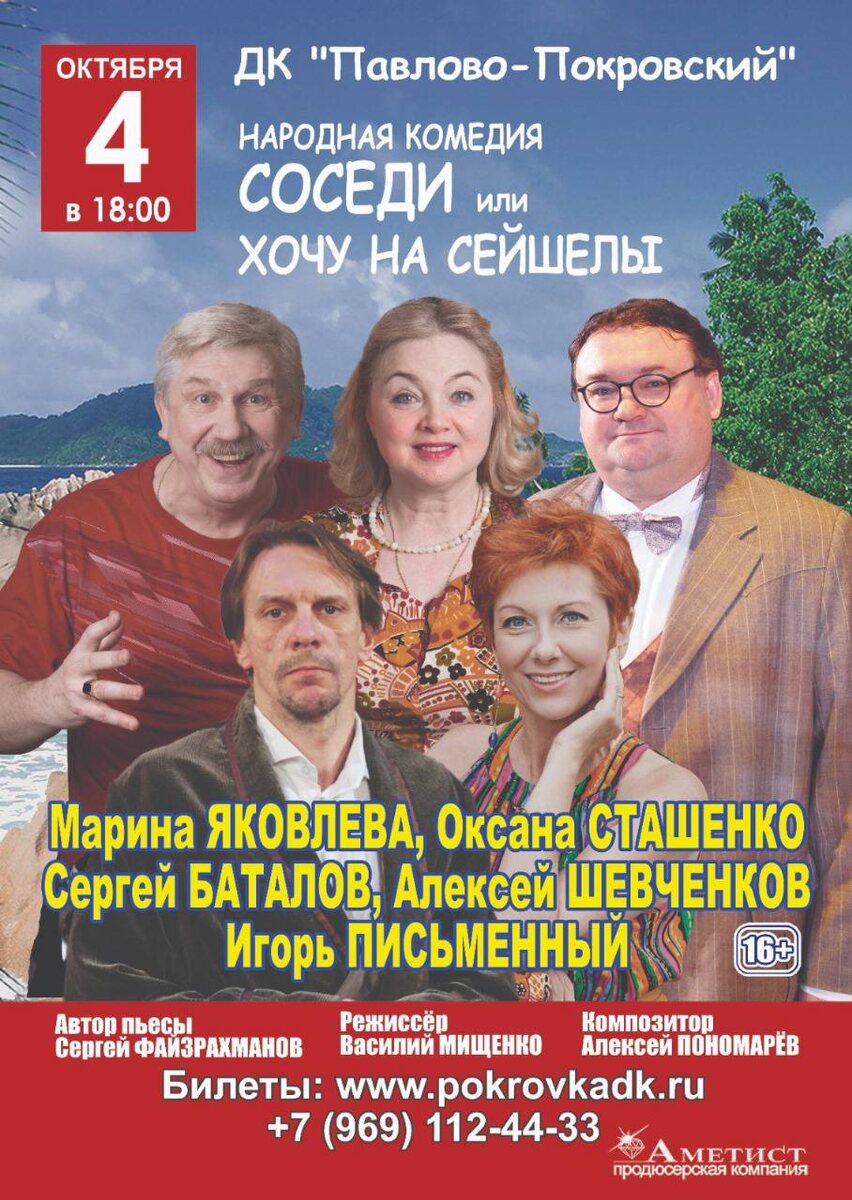 Театральная осень в Павловском Посаде: Открываем сезон с народной комедией! 🎭🎉 Дорогие друзья! Объявляем о долгожданном открытии театрального сезона в Павловском Посаде! 🎉 И начинаем мы с яркой, искрометной и по-настоящему народной комедии «СОСЕДИ или Хочу на Сейшелы»! 4 октября в 18:00 в ДК «Павлово-Покровский» вас ждет вечер, полный смеха, тепла и самых положительных эмоций! 🤣 Встречайте знакомые ситуации и любимые типажи в духе легендарных «Сватов»! На сцене - звездный состав: Сергей Баталов, Алексей Шевченков, Игорь Письменный, Оксана Сташенко и Марина Яковлева! Эти актеры заставят вас поверить, что счастье – не на далеких Сейшелах, а в тех, кто рядом с вами каждый день! 💖 ✨ Не пропустите возможность отвлечься от забот, посмеяться от души и почувствовать, как важно ценить настоящих друзей и близких! ✨ Специально для вас - скидка 30% на билеты по промокоду СОСЕДИ30! 🎟️ Как воспользоваться скидкой? Легко! • Заходите на сайт ДК «Павлово-Покровский»: http://pokrovkadk.ru/