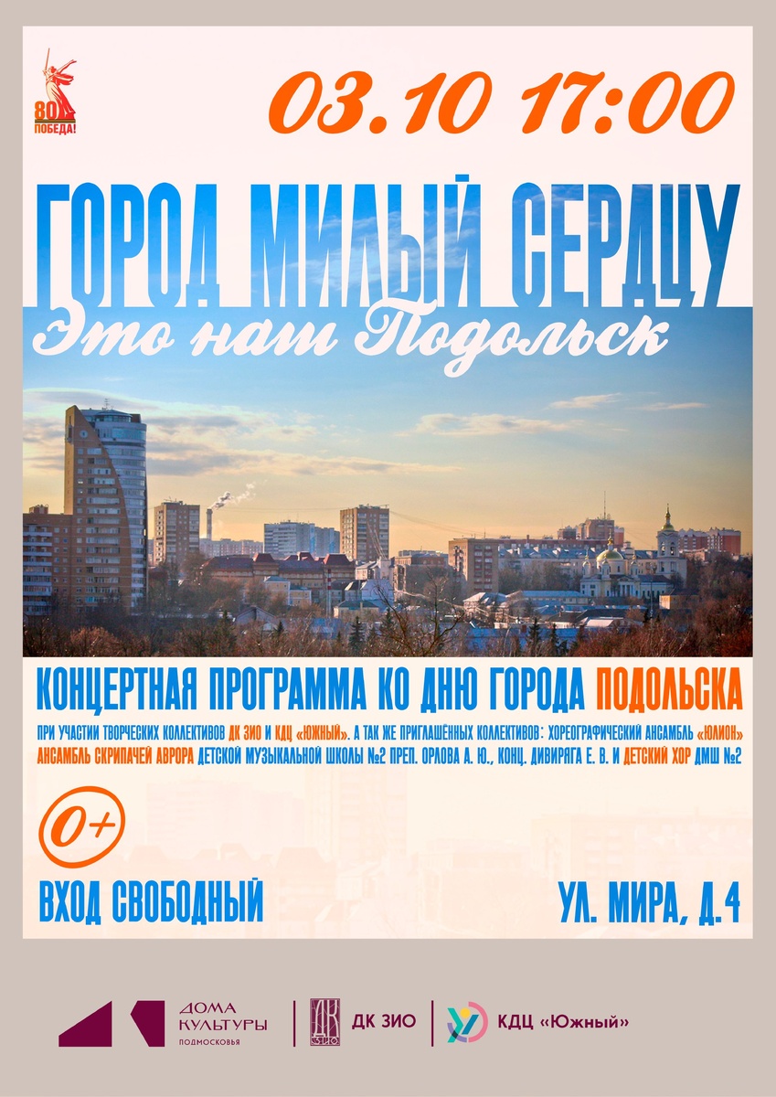 ✨ Концертная программа ко Дню города Подольск 2025 В программе участвуют: 🎵 Творческие коллективы ДК ЗИО и КДЦ «Южный» 🎹 Детский хор ДМШ №2 🎻 Ансамбль скрипачей «Аврора» 💃 Хореографический ансамбль «Юлион» 🚫 Возраст: 0+ 📆 03.10.2025 🕒 17:00 🏢 ДК ЗИО 📍 г. Подольск, ул. Мира, 4 💰 Вход свободный❗️ ⭐Поддержать канал голосом 💰 Вакансия - курьер в Подольске ✅ Мероприятия Подольск https://dzen.ru/id/66ed500f7b5671493eca3fd6 http://vk.com/podolsk_events http://dzen.ru/podolsk_events