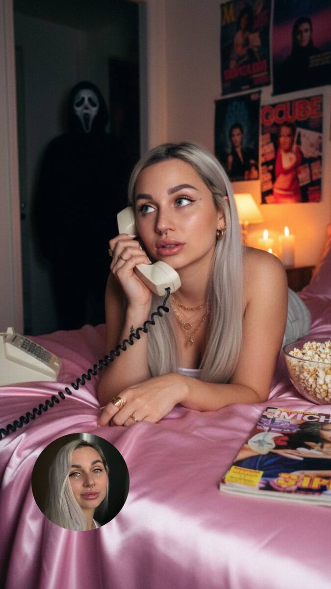 Решила повторить тренд) мне кажется только последняя более менее похожа:) Как сделать? заходим сюда > пишем промт > вставляем фото Промт: Create a photo of me in a dreamy Y2K style portrait. She is laying on shiny pink satin bedding, slightly hanging off the edge of the bed, thoughtfully twirling the cord of a large 90s-style phone around her fingers in a playful, daydreaming pose. She wears delicate jewelry including dainty gold necklaces, accessories, and chunky gold rings. The room is softly lit and atmospheric — dimly illuminated by the warm glow of candles and a small lamp, creating a moody, intimate night-time setting. The walls are decorated with 90s-style posters, and the photo has a grainy 90s aesthetic. A bowl of popcorn and some 90s-style magazines rest beside her. In the background, the Ghostface killer is standing in the doorway of a dimly lit hallway, his figure partially hidden in shadow, adding an ominous and eerie vibe. #каксделать