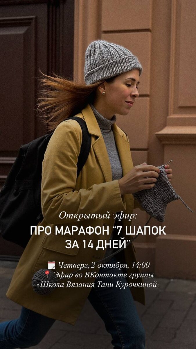 🔊 Открытый эфир: старт марафона “7 шапок за 14 дней” 🗓 Четверг, 2 октября, 14:00 📍 Эфир во ВКонтакте группы «Школа Вязания Тани Курочкиной» Без лишней мишуры — расскажем, как всё будет устроено: 🔴 Что за марафон, зачем 7 шапок и почему за 14 дней 🔴 Как участвовать: форматы с разным уровнем вовлечённости 🔴 Что приготовить: список пряжи, спицы, где уроки 🔴 Какие призы и подарки получат самые активные 🔴 Куда передаём шапки (если вы участвуете в благотворительном формате) ✔️Плюс: расскажем, как оформлять свои работы, чтобы они не терялись в ленте, а реально собирали лайки, комментарии и выигрывали призы - как научиться всему этому?! Для тех, кто хочет расти и в оформлении: на эфире расскажем, как попасть в наш клубный круг с доступом к большому курсу по съёмке аксессуаров, где всё — от света до композиции. Без воды. Только структура, детали и ответы на вопросы. 💯 Присоединяйтесь — эфир открытый, можно звать подруг, подписчиков и тех, кто “давно хотел, но всё никак”. Ссылка