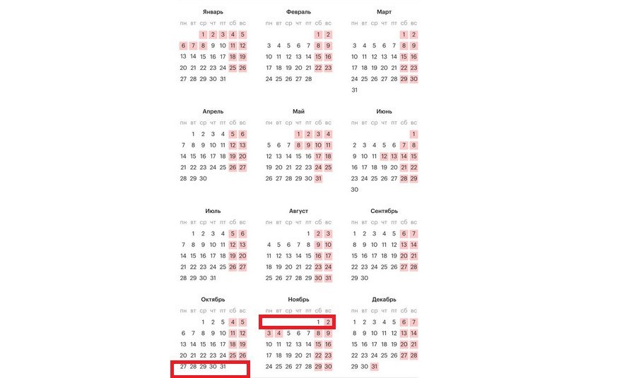 Последняя рабочая неделя октября будет шестидневной. После этого россиян ждут три выходных дня. 1 ноября (суббота) официально будет сокращенным на один час днем вне зависимости от продолжительности смены сотрудников.