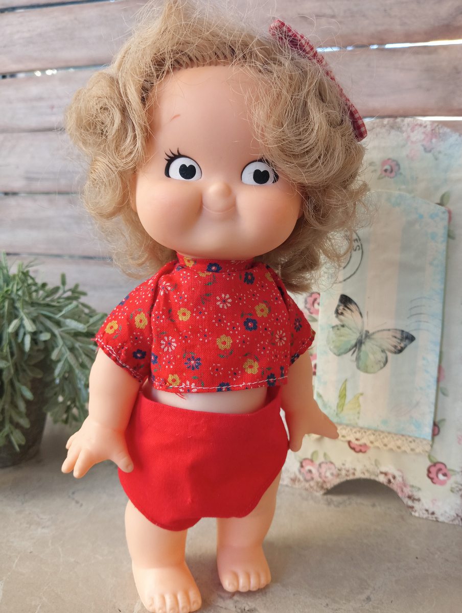 Сегодня я хочу поделиться с вами историей своей новенькой — винтажной куклы Campbells Soup. Эта кукла не просто игрушка, а настоящая жемчужина коллекции, ведь она связана с историей знаменитого супа Campbell и его рекламной кампанией. Создательницей этих очаровательных образов была Грейс Дрейтон, талантливая художница, иллюстратор, чьи работы начали появляться в начале 1900-х годов в Англии. Её пухлые детки стали символом детства и радости, а куклы Campbells Soup стали популярными у коллекционеров и любителей винтажа. Эта кукла, примерно 1964 года выпуска, удивительно хорошо сохранилась. Её оригинальная одежда, включая милый бантик, на фабричной закрепке держится на голове и всё ещё в отличном состоянии. В глазках сердечки, до чего же это мило) Однако, как и любая винтажная вещь, она нуждается в небольшом уходе — покрыта пылью и требует бережного восстановления. Буду приводить её в порядок. Сошью новый сарафан, а родную одежду сохраню, чтобы подчеркнуть её уникальный стиль. У