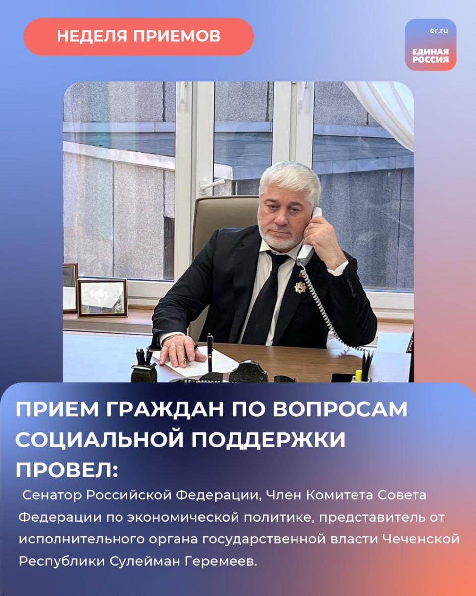 Ассаламу 1алейкум, друзья! 🚩1 октября 2025 года дистанционный прием граждан по вопросам социальной поддержки провел Сенатор Российской Федерации, Член Комитета Совета Федерации по экономической политике, представитель от исполнительного органа государственной власти Чеченской Республики Сулейман Геремеев. ⠀ 🔔На встрече жители региона подняли различные вопросы, связанные с социальной поддержкой, такие как социальные льготы для инвалидов, пенсии и пособия и другие. ⠀ 🔹Не остались без внимания и жилищные вопросы: участники встречи высказали свои проблемы, связанные с условиями проживания и доступностью жилья. ⠀ ✅Все поступившие обращения были зафиксированы и взяты на контроль для дальнейшего детального рассмотрения. Заявителям были предоставлены устные консультации по их вопросам, что позволяет им понять дальнейшие шаги и варианты решения их проблем. ⠀ #ЕдинаяРоссия #ЕРпомогает95 #ЕР95