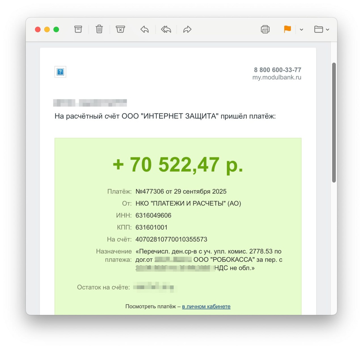 Так приходит поступление от Робокасса. Клиенты платят картой, Робокасса копит и по расписанию переводит автоматом. Очень удобно. В данном случае - clickfraud.ru. 50% клиентов платят картой, 50% по безналу. Напомню, Робокасса сразу ФЗ54 соблюдает и шлет чек, очень удобно для SAAS. Русский ИТ бизнес