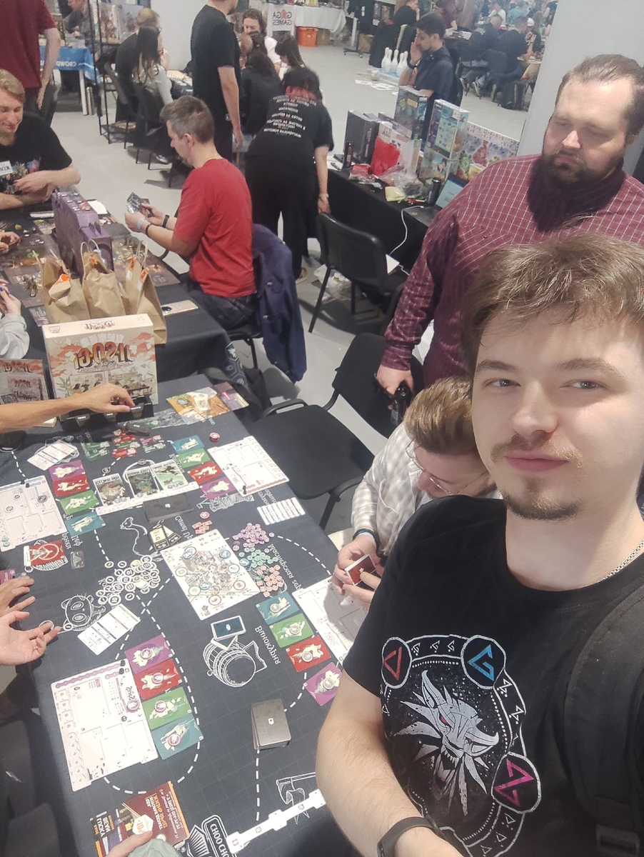 Сыграли ещё раз партию в Легенды дикого запада (спойлер, в дальнейшем вы увидите эту настолку неожиданно в топе любимых игр). Что можно сказать на этот раз? Играли без кровавых денег, что как будто чуть-чуть делает игру менее комплексной, но получил тоже крайне высокое удовольствие. Несмотря на то, что ещё и закончил на 3 месте - беда была в том, что решил не обвешиваться аксессуарами и причиндалами и шнырял чуть по чуть угоняя скот, немножко играя в покер немножко копая золотые самородки, и вроде бы шёл очень даже неплохо в сравнении с картёжником мыльным Питом, а также с Бандитом, который постоянно всех грабил и Маршалом, который возомнил себя олицетворением закона, и нападал последние ходы именно на меня, хотя преступниками были все,... И под закрытие занавеса он арестовал меня и лишил огромного Богатства! - порядка 110 долларов, что уже как будто весомая сумма для того, чтобы спустить её в кабаре, так ещё и всех очков бандита, что стоило мне как минимум 5 очков легенды. Но все равно игра очень весёлая и смешная. Очень множество стратегий добавляется с дополнениями - и необязательно тебе только фармить слитки. Хочешь - шастай по фронтиру, хочешь - грабь поезд (отличная тема, рекомендую всем, особенно когда тебя избивают клоуны), а с кровавыми деньгами ещё и сильно порицаются ранения и нормально так можно навариться на покупке недвижимости! В общем, отличная игра. Пожалуй, стоит раскладывать её, чаще, напрашиваться в гости к друзьям, у кого она есть.