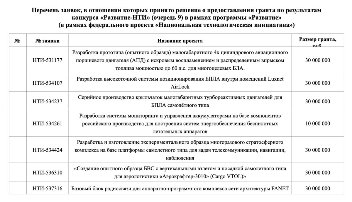 ФСИ опубликовал победителей грант "Развитие-НТИ". См. картинку. Направление БПЛА в топе. Не удивительно, это очень перспективно на многие года. Роботы + БПЛА = бабульки для стартапа :) И деньги ощутимые выделяют - завидую по доброму. Русский ИТ бизнес