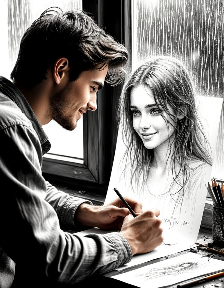 a handsome guy drawing a girl on a piece of paper, sitting by the window. the drawn girl on the paper is looking at the guy. she is smiling and nodding her head. it is raining outside. raindrops are streaming down the glass. the guy is drawing with a pencil. with clear pencil lines, he draws the girl's face on the paper, realism, beauty, detailed, atmospheric (красивый парень рисует девушку на листе бумаги, сидя у окна. нарисованная девушка на бумаге смотрит на парня. она улыбается и кивает головой. на улице идет дождь. капли дождя стекают по стеклу. парень рисует карандашом. четкими карандашными линиями он выводит лицо девушки на бумаге, реализм, красота, детализировано, атмосферно) Подписывайтесь на мой ТГ канал НейроДом: https://t.me/qweTAMARA2024WB , там много интересной информации. Это не просто список объектов. Это — сценарий. Я не сказала нейросети «нарисуй парня и девушку». Я рассказала ей историю, полную действия и эмоций: «Нарисованная девушка... смотрит на парня, улыбается