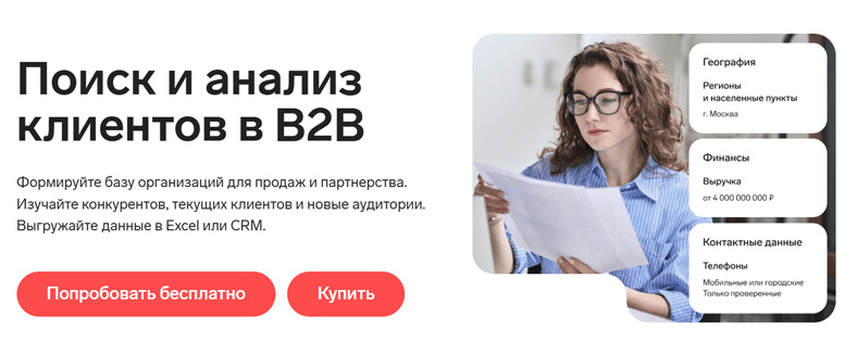 Сервис позволяет создавать точные выборки компаний за несколько минут. Вы можете фильтровать организации по критериям, включая отрасль, регион, финансовые показатели, количество сотрудников и многое другое. Полученную базу можно выгрузить в Excel или в CRM.