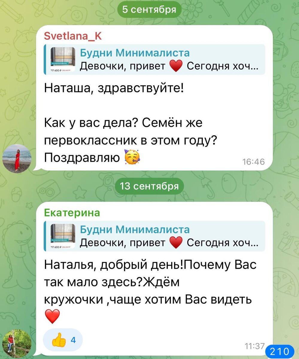 Девочки, совсем забросила я этот канал, давно меня тут не было… Очень приятно, что ждете♥️ я бы с удовольствием бы вела все свои каналы, но откуда взять время на все… Семён пошел в школу и мне кажется время стало лететь еще быстрее… В сентябре было вдохновение на статьи на дзен, писала на мой взгляд много, заглядывайте если что♥️ И на ютуб публиковала ролики… Чтобы вести телеграмм, мне нужна какая-то тема, вот тогда я думаю получится более-менее регулярно тут появляться… У кого какие мысли? Про что писать тут? Уборка, расхламление, спорт, питание? 🤷🏻♀️ У кого какие идеи? 💡