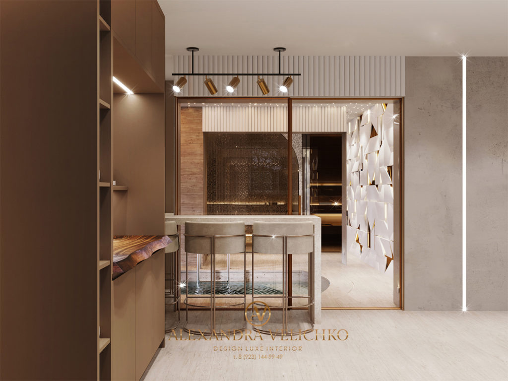 Расскажу, почему был выбран именно этот стиль, и покажу, что вышло. Вам понравится – всем нравится! Создание проекта интерьера спа-зоны в частном доме всегда начинается с выбора стиля. И очень уместным в данном случае будет эко-стиль мягкого минилизма, он же – тихая роскошь. Дизайн спа-зоны в современном эко-стиле мягкого минимализма – это возможность создать все условия для отдыха премиум класса прямо у себя дома. Говоря проще, в собственном доме появится личный райский уголок. Меня зовут Александра Величко, я – дизайнер интерьеров. Продолжаю показывать вам свои работы, сегодня вы увидите дизайн спа-зоны в эко-стиле и стиле мягкого минимализма, а также узнаете несколько интересных особенностей этого стиля. Дизайн-проект для спа-зоны вышел роскошным, позволяющим владельцу жилья почувствовать себя избранным. Как было сказано выше, дизайн спа-зоны загородного дома выполнен в сэко-стиле и стиле мягкого минимализма. Так называемая тихая роскошь сочетает в себе практичность, элитный дизайн