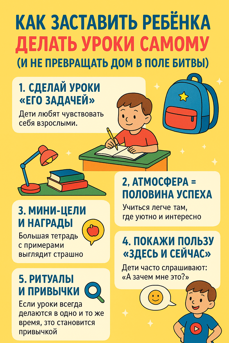 Каждый родитель мечтает о том, чтобы ребёнок сам садился за уроки без напоминаний и уговоров. Но в реальности часто всё заканчивается слезами, конфликтами и усталостью. Как же выстроить систему так, чтобы домашка перестала быть войной? Давайте разберёмся! 💡 Дети любят чувствовать себя взрослыми. Если ребёнку постоянно напоминать, он перестаёт видеть в этом свою ответственность. Попробуй: Учиться легче там, где уютно и интересно. Большая тетрадь с примерами выглядит страшно. А вот «сделать пять задачек – и перерыв» звучит проще. Дети часто спрашивают: «А зачем мне это?» Если уроки всегда делаются в одно и то же время, это становится привычкой. Заставить ребёнка делать уроки самому реально!