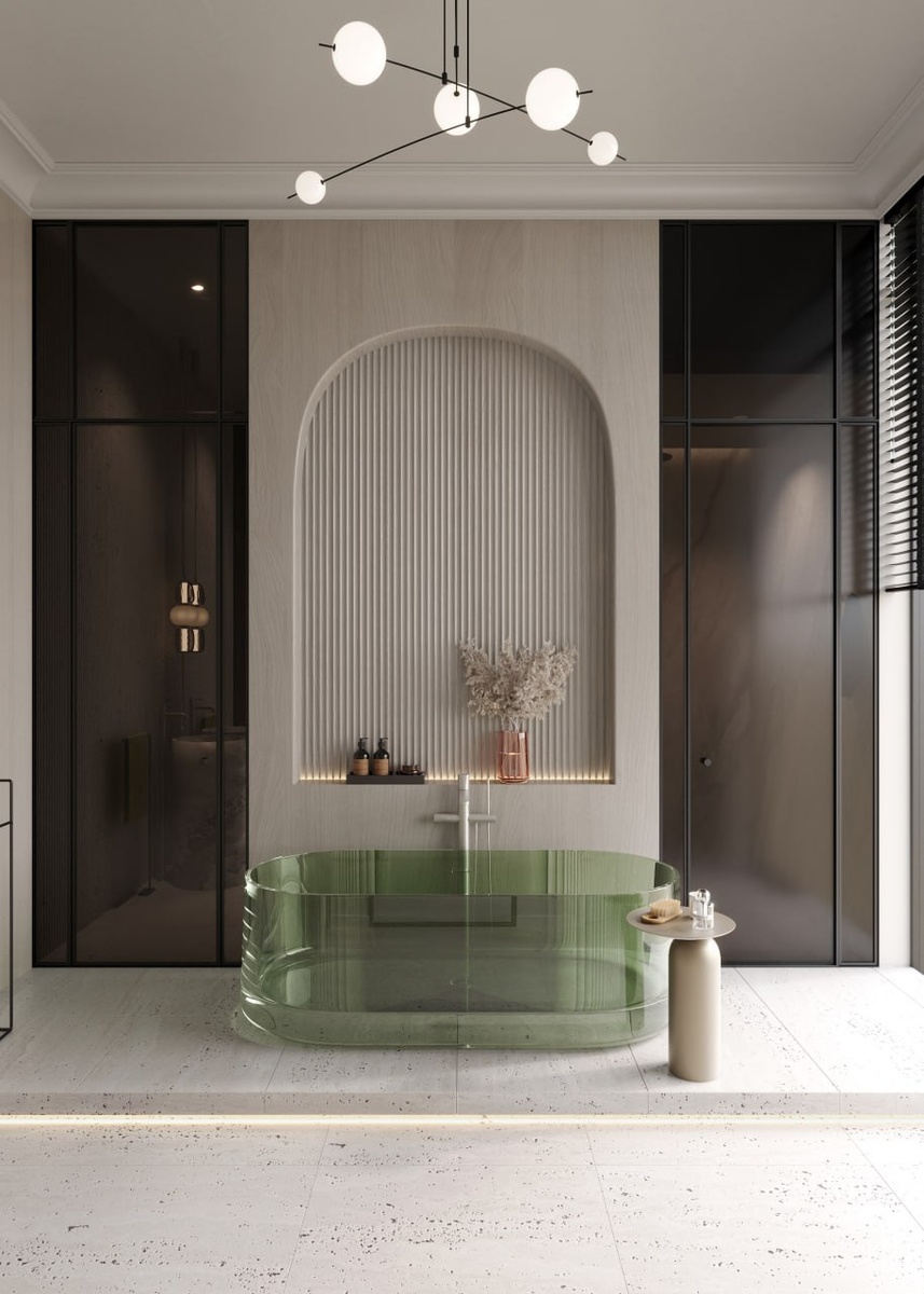 #KRASNOV_FranksHouse Давно хотел показать эту ванную. Первое, что притягивает взгляд, конечно, зелёная ванна из полиэфирной смолы. Он успокаивает, даёт ощущение отдыха. А смола делает ванну визуально лёгкой: она не выглядит тяжёлым блоком, а как будто парит в пространстве. Важен и свет. Днём мягкое естественное освещение проходит сквозь полупрозрачные стенки, в воде рождаются блики, и ванная кажется шире. Вечером работает архитектурная подсветка, и ванна начинает сиять. Материалы подобраны так, чтобы поддерживать это ощущение лёгкости. На полу светлый камень с живой текстурой. Стены обшиты древесным шпоном, который добавляет тепла. А мраморная столешница у раковины работает контрастом: она плотная, с выраженным рисунком, и именно это создаёт баланс. Зелёный здесь выбран не случайно. Он стал акцентом, который связывает интерьер с природой за окном. А в деталях добавлены бронза и чёрные линии — для графичности и ощущения завершённости. Это ванная про тишину, свет и комфорт. Когда к