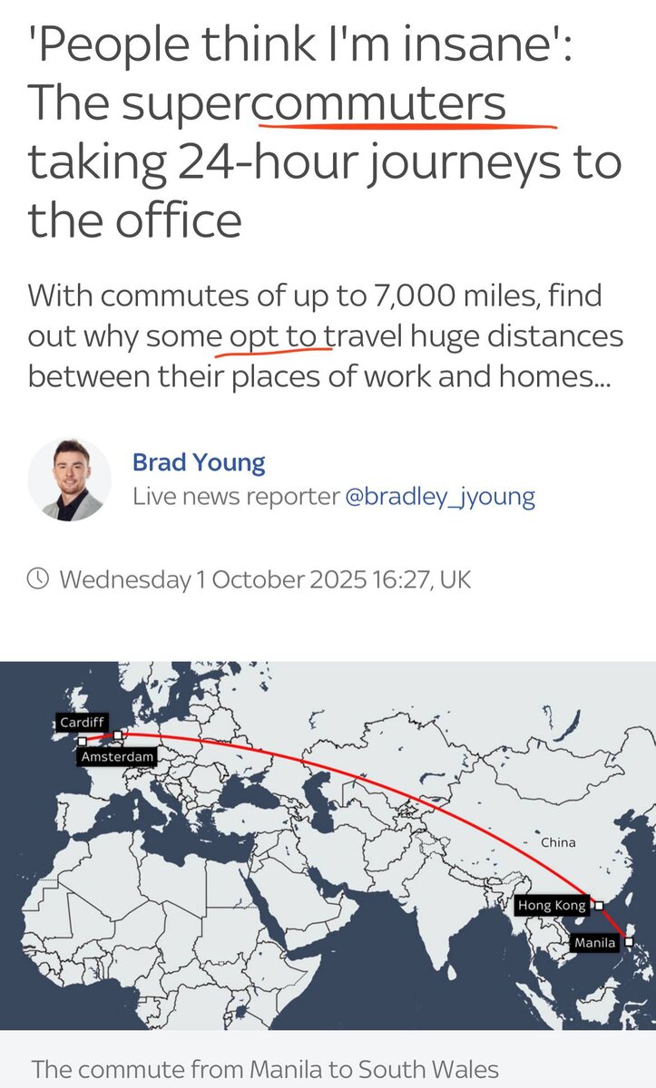 Ну что неплохо! Я так тоже иногда по пробкам утром добираюсь до центра 😐 (и даже и не утром тоже) to commute - добираться до работы commuters opt to - make a choice Extracts from the article: He convinced his wife and two sons to move north 18 months ago and now spends approximately £8,300 each year on three commutes a week to his media job in Soho Square. "You've got to bear I mind that you're not living in a big house that's accumulating London prices increases, and you're paying more money to a train company," he admits. He spends £1,000 a month getting up at 5.10am to board the ferry to Portsmouth, catch a train to Waterloo and then a tube to Bank before, a short walk later, sitting down at his desk at 8.10am in Liverpool Street. It's a six-hour round trip - but has sometimes lasted as long as eight and a half hours due to missed connections or cancellations. Работа наше всё Read yourself here 📰