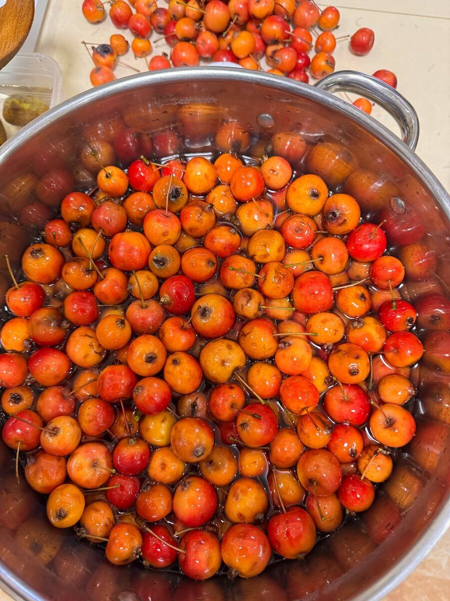 Добрый вечер всем! Сегодня снова в бегах ☺️ Тем более погода у нас опять наладилась, потеплело. В саду и огороде работы много. 🍎 Собрала ещё ранетки (райские яблочки), оставляла на варенье. Вот и руки дошли😊 Сделала всё как в инструкции. Оставила пока на 5 часов стоять. И дальше опять по инструкции. Если делать всё пошагово, как описано в рецепте, варенье будет готово только завтра к вечеру 😍 Надеюсь всё получится, варю впервые. Потом покажу 🍎🍯 Ещё раз всем огромное спасибо за присланные в чат рецепты 🙏😍😍