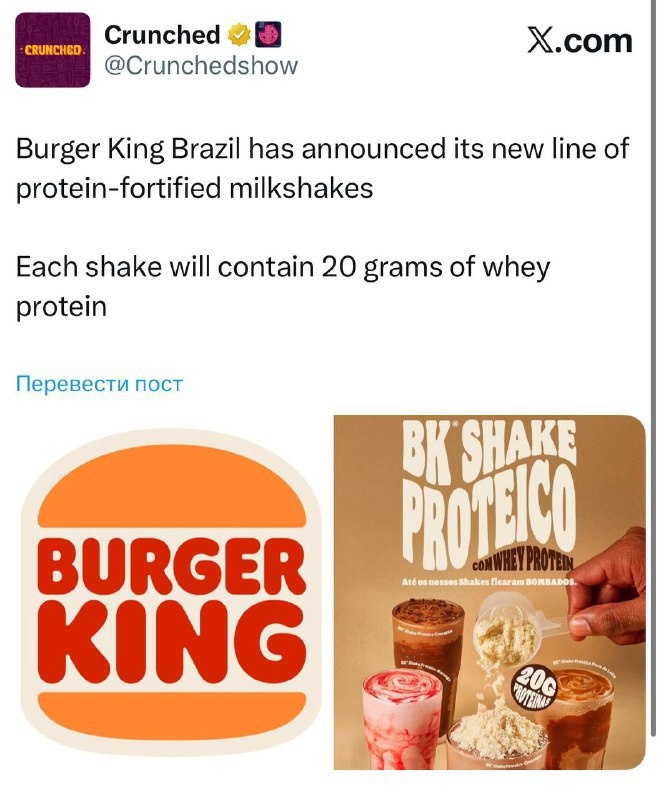 Бразильский Бургер Кинг представил новую серию молочных коктейлей с добавлением протеина. Каждый коктейль будет включать 20 граммов белка. Тренд на правильное питание уже достиг и фастфуда.
