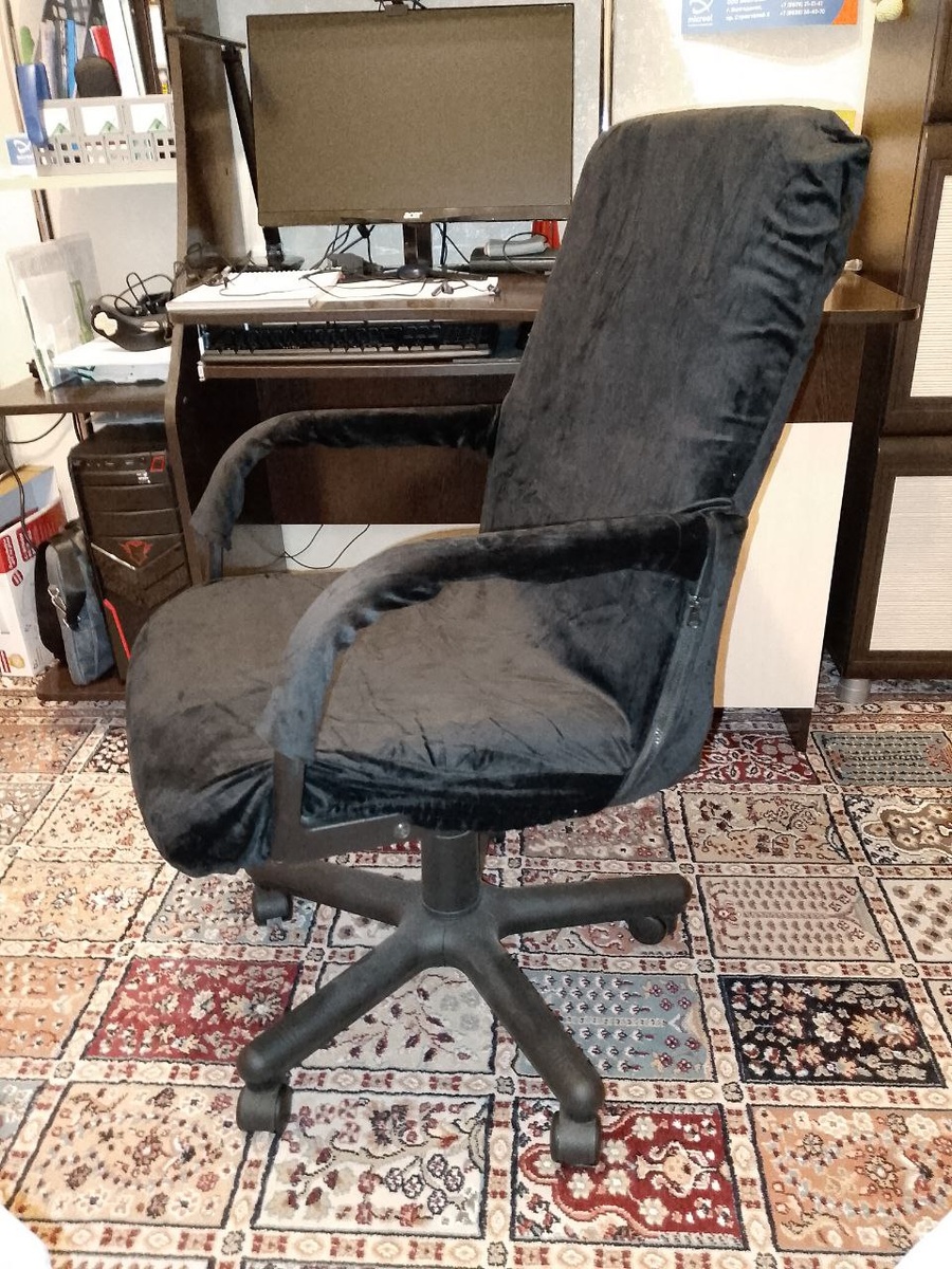 Тот чехол, который я присмотрел ранее, предназначен для кресла с заметно более высокой спинкой, от 65 см, а у моего и до 60 недостаёт. Поэтому пришлось искать другой, а также смириться, что цвет у него только чёрный 🤷♂.