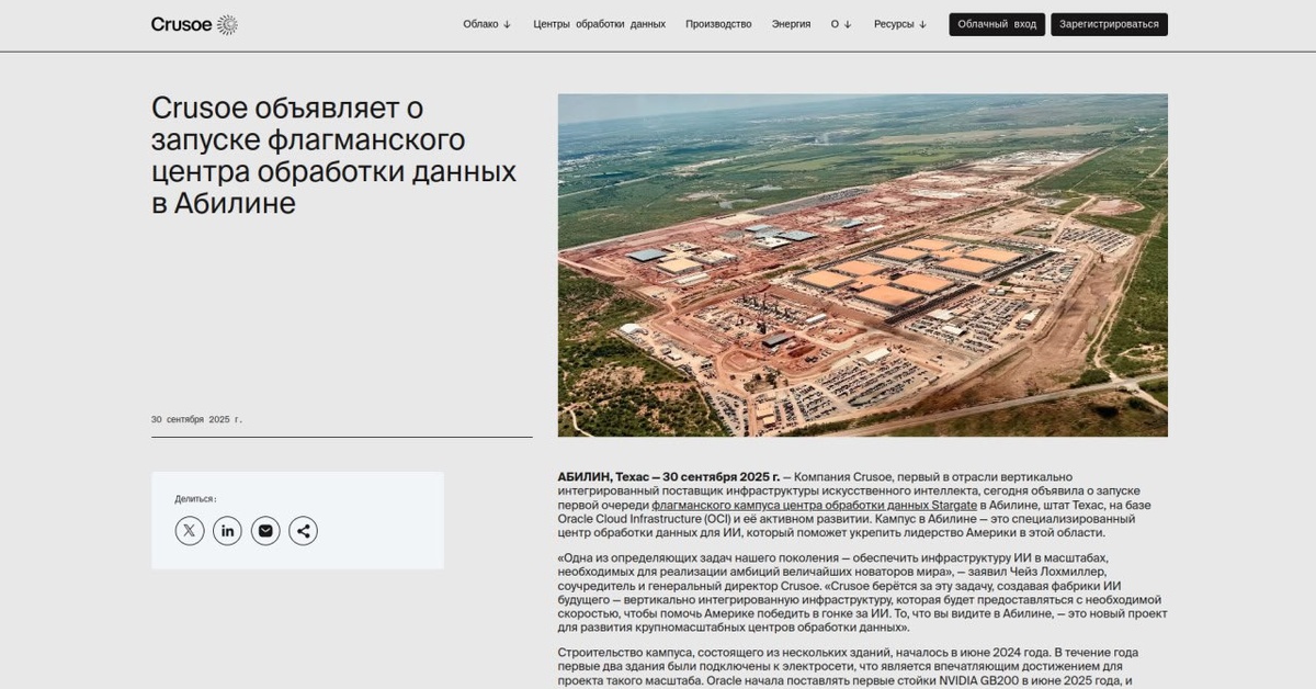 Продолжение: пока ИИ создаёт геномы, для него строят гигантские дата-центры Компания Crusoe запустила огромный дата-центр в Техасе меньше чем за год. Oracle уже начала поставлять туда стойки NVIDIA GB200, и центр выполняет первые задачи по обучению ИИ. Когда строительство завершат, там будут сотни тысяч GPU в единой сети. Здание спроектировано специально для мощного ИИ-оборудования с жидкостным охлаждением. Картина складывается интересная — ИИ учится создавать живые организмы, проектирует собственные чипы, а люди параллельно строят для него всё более масштабную инфраструктуру. От микроскопических вирусов до гигантских дата-центров — технология растёт одновременно во всех направлениях. Причем скорость этого роста только ускоряется. via #ДатаЦентр #Crusoe #Oracle #NVIDIA #ИИИнфраструктура