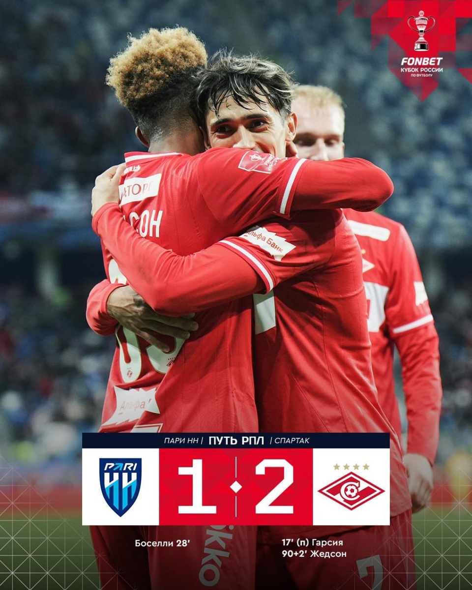 ❗️«Спартак» вырвал победу у «Пари НН» в самой концовке матча Кубка России Игра пятого тура Пути РПЛ завершилась со счётом 2:1. Красно-белые вышли вперёд на 17-й минуте, когда точным ударом с пенальти отметился форвард Ливай Гарсия. Гости же ответили выстрелом Хуана Босселли со штрафного на 28-й минуте. Решающий момент встречи случился на 93-й минуте: с передачи Пабло Солари отличился Жедсон Фернандеш, принёсший своей команде три очка. «Спартак» набрал 10 очков и располагается на втором месте в группе С. «Пари НН» (3) занимает третью позицию. @russian_rt_sport