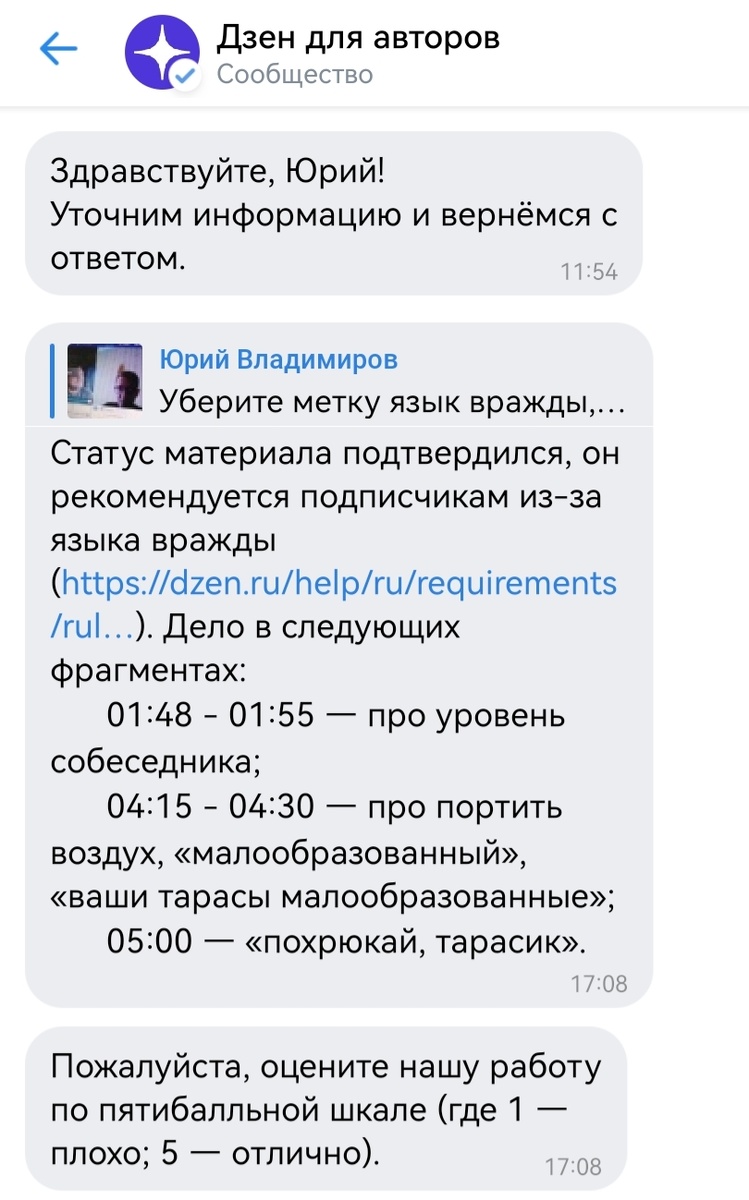 Приветствую всех читателей. Я учитель истории, работаю по специальности с 2012 года. В 2022 году впервые вышел в чатрулетку, дабы поговорить с жителями 404й страны об истории и с тех пор коллекционирую антинаучные мифы оттуда Да, каждый житель соседней страны переносчик антинаучных мифов. А все вместе они складываются в натуральную расовую теорию, которая сильно похожа на расовую теорию 3 Германского Рейха. Уже год я выкладываю записи таких бесед в дзен и такие видео собирают много просмотров (по меркам моего скоромного канала) На это жалуются все проросссийские блогеры - эта платформа как то странно и выборочно ограничивает патриотических авторов. Особенно "чатрулетчиков". Доходит даже до блокировки каналов. Якобы за "язык вражды" Вот такой диалог скинули админы в нашу переписку Когда нибудь история оценит их работу на информационном фронте. Как-бы отечественная платформа, но подыгрывающая нашим врагам.