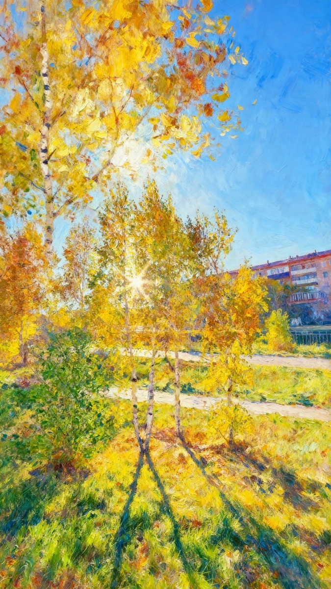 Солнце октября — это вежливый прожектор, который не торопит, а просто отмечает присутствующих: берёзы, запоздалые мухи, людей с пакетами и