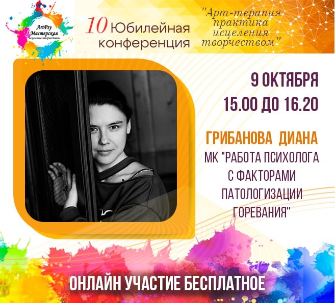 🎨МК "Работа психолога с факторами патологизации горевания" Время: 9 октября 15.00 - 16.20 ⭐️Спикер: Диана Грибанова Психолог-консультант, супервизор https://vk.com/club, преподаватель центра "Метафора", Портала ДПО, кандидат психологических наук ✨ Участие бесплатное!!! Ссылка на регистрацию https://forms.yandex.ru/u/68adf277493639046ec1bc1b 🌸Также вы можете приобрести записи по ссылке https://artpsy.top/kh-yubilyeynuyu-konferentsiyu-art-terapiya-praktika-istseleniya-tvorchestvom Будем рады вас видеть⭐️