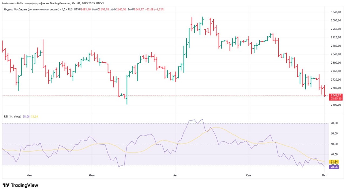 ❗️1 октября российский фондовый рынок вновь ушел вниз, индекс МосБиржи подешевел на 1,39% до уровня 2647,25