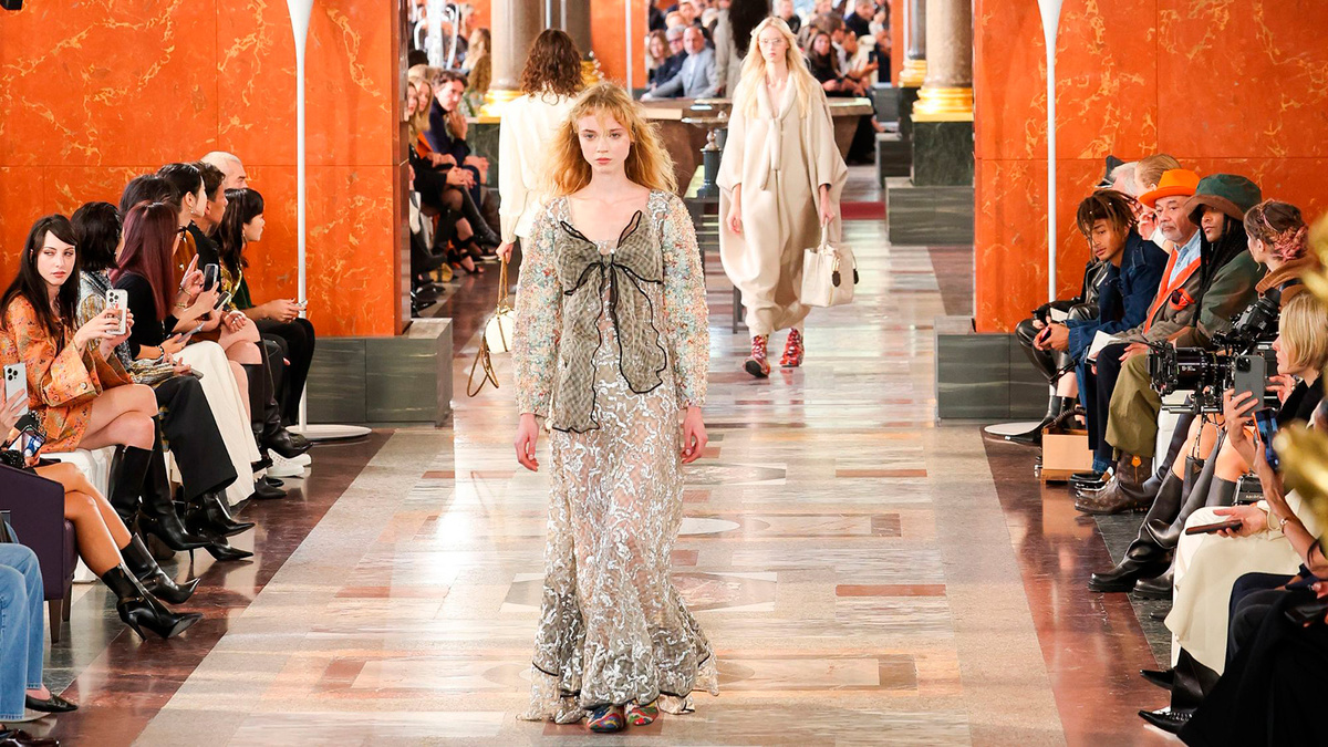 Николя Жескьер уже не в первый раз обращается к богатствам Лувра для показа новой коллекции Louis Vuitton. На этот раз вдохновением стали летние апартаменты Анны Австрийской, супруги короля Франции в XVII веке. Высокие расписные потолки, мраморные полы и арочные окна наполнили показ атмосферой истории, а сценограф Мари-Анн Дервиль дополнила пространство мебелью, которую королева могла бы узнать, и элементами ар-деко XX века. «Это был уникальный момент, когда мы могли занять апартаменты, и именно он стал отправной точкой для размышлений о коллекции. Она — о близости и об искусстве жить, о том, чтобы одеваться прежде всего для себя. Это похоже на прогулку по собственной квартире», — объяснил Жескьер. Коллекция, представленная дизайнером, далека от спортивного стиля и не являются прямой интерпретацией костюмов XVII века с кружевными жабо и корсетами. Но лёгкая комбинация с брюками и халатом, открывшая показ, или короткое платье из розового шёлка с меховой отделкой по горловине отсылали к