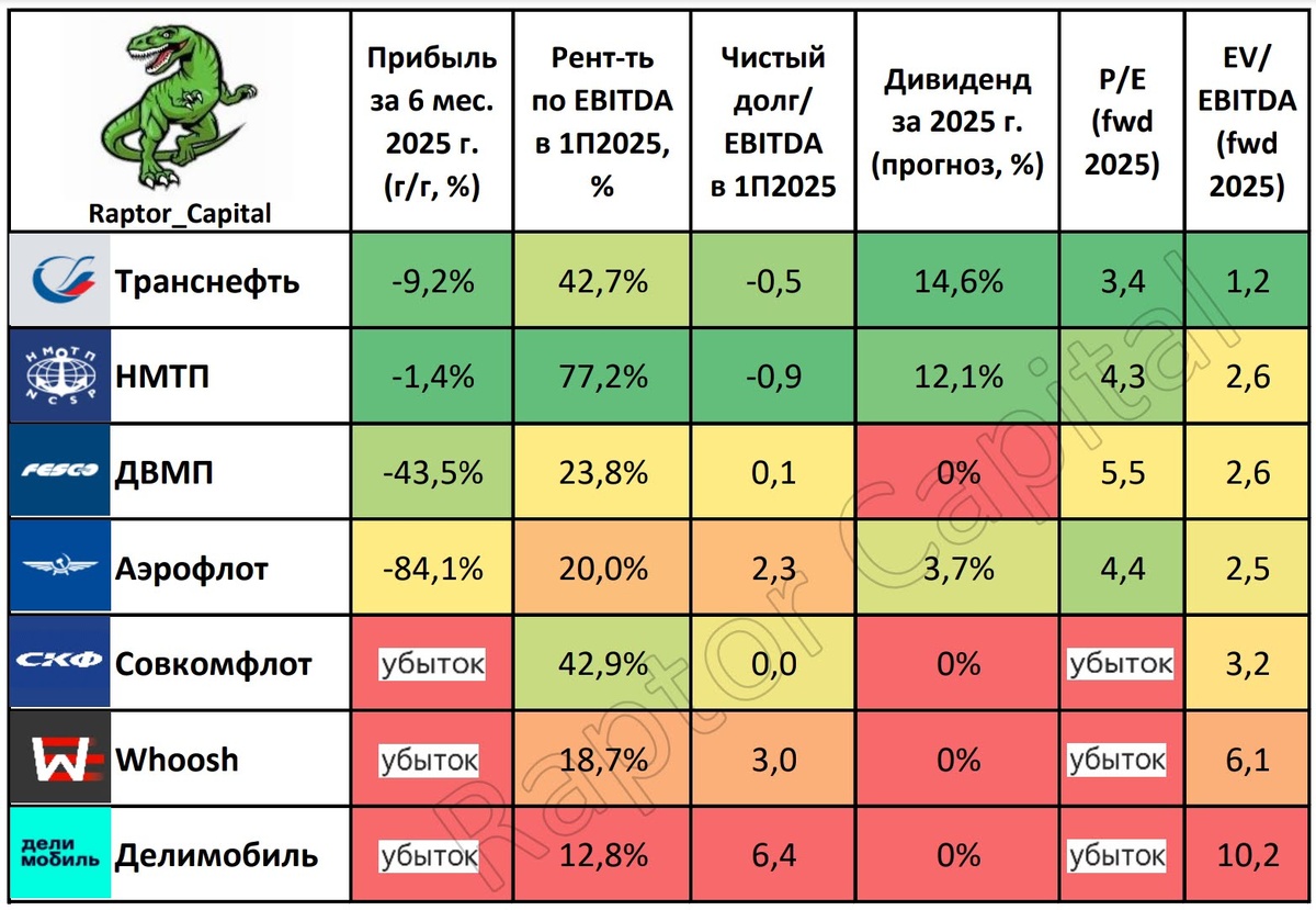 📌 Продолжаем обзор секторов компаний Мосбиржи, и сегодня взглянем на транспортный сектор. Напомню, ранее я делал обзоры нефтегазового сектора, банков, IT-компаний, ритейлеров, золотодобытчиков, удобрений, металлургов и застройщиков. • Один из самых разношёрстных секторов, поскольку транспорт может перевозить как людей по асфальту, так и нефть по трубам или через моря. По этой причине не совсем корректно сравнивать компании между собой, но вполне можно сделать отдельные выводы и выявить лидеров. • По итогам 1 полугодия компании разделились на два лагеря: для одних проблемой стал крепкий рубль, для других – высокая ключевая ставка. Первые потеряли прибыль из-за курсовых разниц, вторые нарастили долговую нагрузку и оказались в зоне убытка. • Уже пятый по счёту сектор, в котором прибыль упала у всех компаний. Причины падения прибыли разные: персональное повышение налога на прибыль у Транснефти (–9,2% год к году); курсовые разницы у НМТП (–1,4%), ДВМП (–43,5%) и Аэрофлота (–84,1%). • Убыто