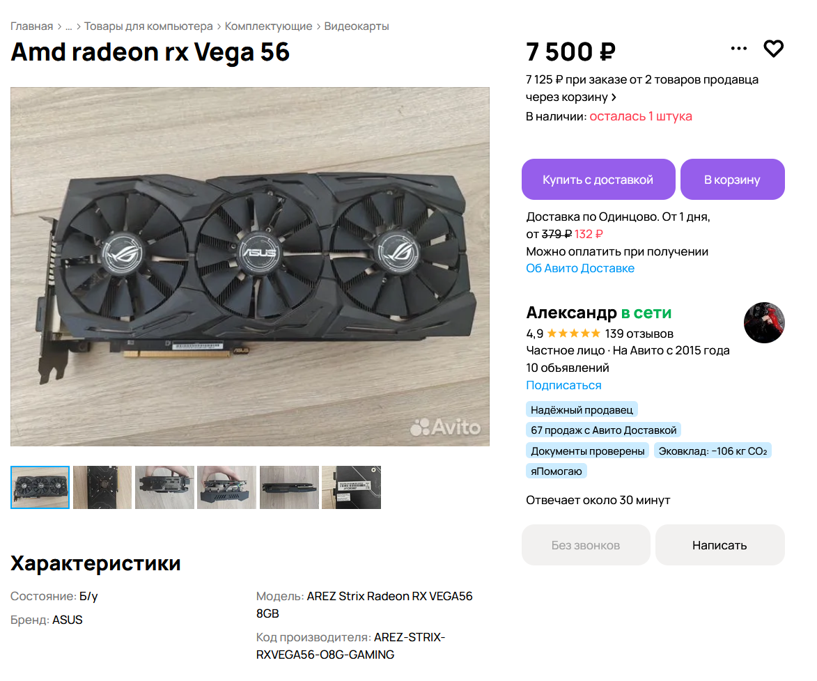 Начнём с неё, так как все остальные комплектующие будем покупать новыми на Яндекс Маркете (советую также посмотреть на Озоне, WB, и других маркетплейсах). Искать будем на Авито, так как новые видеокарты стоят неоправданно дорого для нашей сборки.
