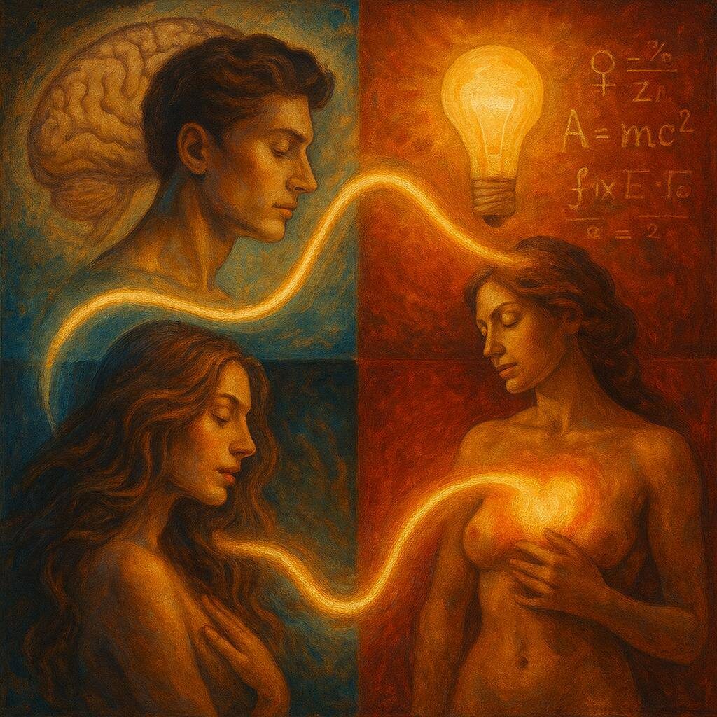 Мы привыкли разделять эти слова: «Гениальность» — в голове. «Сексуальность» — в теле. Но если посмотреть глубже — это проявления одной и той же энергии жизни. Это не IQ и не набор дипломов. Гений — это способность увидеть то, чего ещё нет, и воплотить это в мире. Это соединение интуиции, воображения и внутренней честности. Гений всегда нарушает порядок. Его идеи кажутся «слишком» — слишком новыми, слишком смелыми, слишком преждевременными. Это не только про секс. Это ощущение себя живым: поток желания, магнетизм, тяга к соединению. Сексуальность — способ ощутить в теле силу, которая рвётся к жизни. Культуры тысячелетиями боялись и контролировали эту силу: объявляли её грехом, скрывали, регулировали. Но подавленная сексуальность никогда не умирает — она лишь меняет форму. Энергия, которая движет сексуальностью, — та же, что рождает гениальные открытия. Фрейд называл её либидо, даосы — ци, индийцы — прана. Жизнь → Сексуальность → Сублимация → Гениальность → Возврат в тело → Новая жизнь.