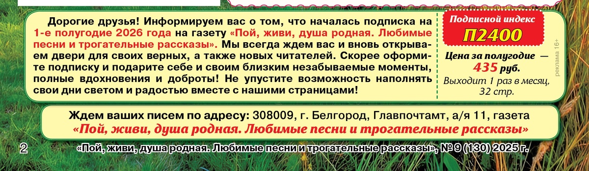 Это не просто газета - это настоящая музыкальная шкатулка, хранящая любимые песни нашей молодости! Каждый номер наполнен теплотой и душевностью: • Тексты любимых песен по вашим заявкам • Тексты задорных частушек • Трогательные, жизненные истории • Увлекательные рассказы о композиторах и поэтах • Интересные факты о создании известных песен • Биографии любимых артистов Особенность нашей газеты в том, что она создается с любовью и вместе с вами! Присылайте свои письма, делитесь историями, заказывайте любимые песни - мы обязательно их опубликуем! Газета станет отличным подарком для ваших родителей, бабушек и дедушек. Она дарит не только приятные воспоминания, но и возможность спеть любимые песни в кругу семьи и друзей. Подпишитесь сами или оформите подписку в подарок своим близким! Пусть каждый новый номер приносит радость и согревает душу! Оформить подписку можно: - В любом почтовом отделении. Индекс газеты П2400. - На сайте Почты России "Пой, живи душа родная" - газета, которая поёт вме
